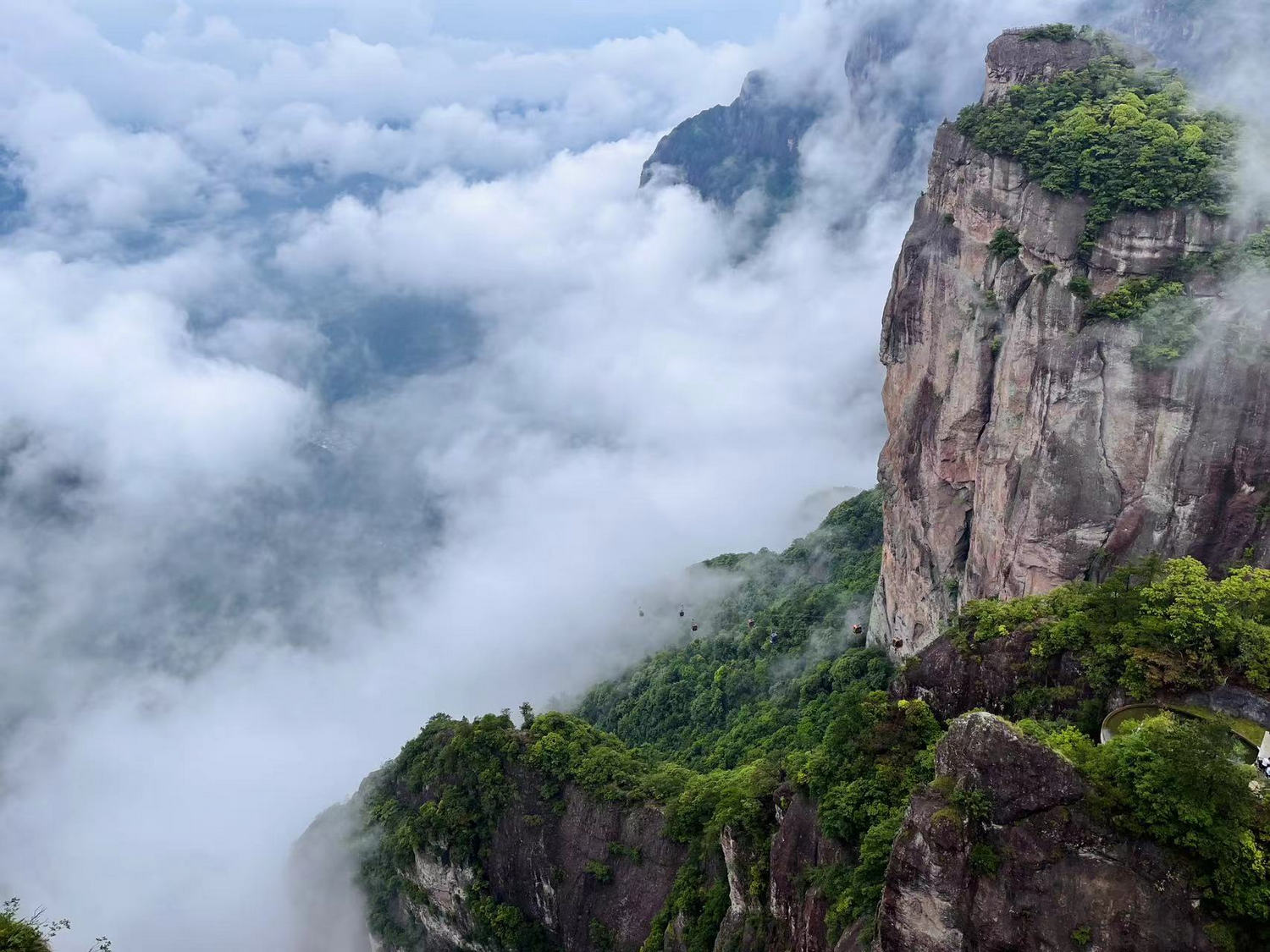 從南天索道上去,自北海索道下來,數(shù)公里的旅程均在數(shù)百米高的棧道上進行。其間依次行走在菩提道、般若道、因緣道、觀音道、飛鷹道與無為道這六條道上。途中鳥鳴婉轉(zhuǎn),移步換景,如置身畫卷之中行走,雖有陡坡亦不足道哉。景區(qū)內(nèi)負氧離子含量奇高,平均達2.1萬個/每立方厘米,最高處達8.8萬個/每立方厘米,是名副其實的天然氧吧。得閑即是仙,行走其間,尋心朝圣,觀得本心,自在愉悅。